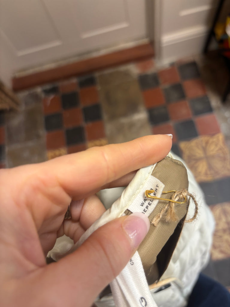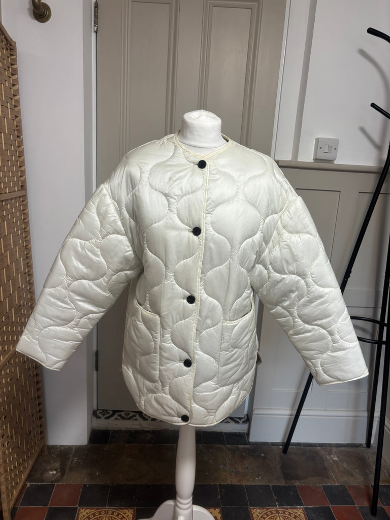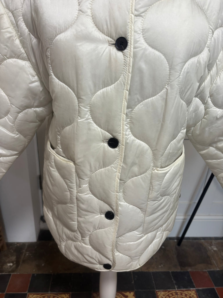 Great conditionSize XS but comes up big would fit an 8-10CreamLight weight quilted Button upPocketsWater resistant
