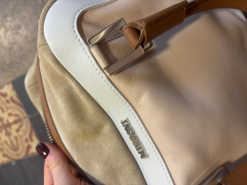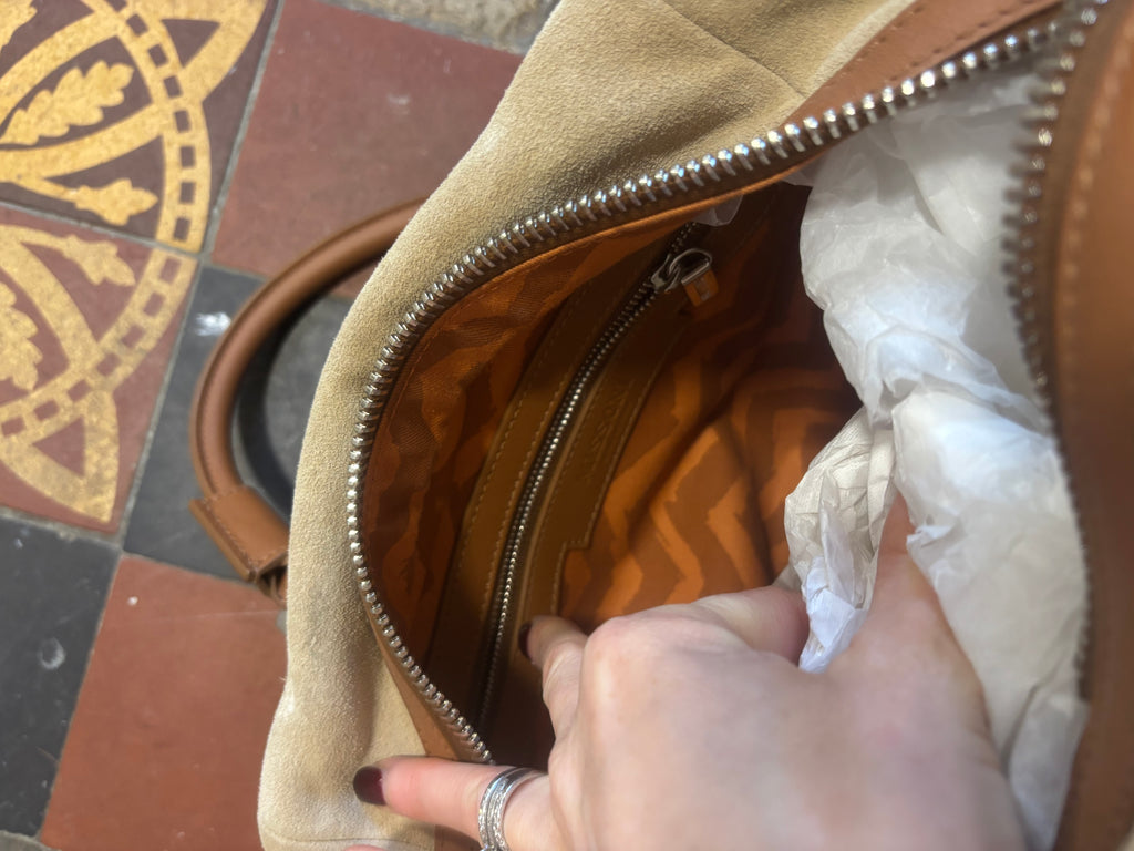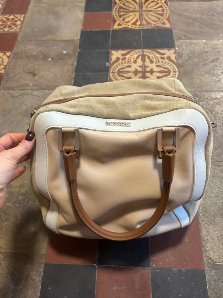 Good conditionSuede and leatherSmall marks on bottom corner as shown in pic Width 12 inchesHeight 10 inchesDepth 6 inches Could fit small laptop / iPad Phone / keys / make up bag