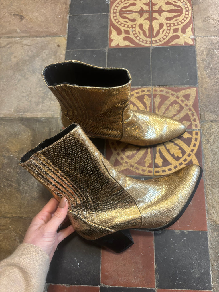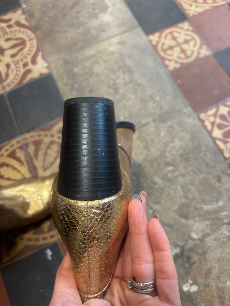 Worn a handful of timesIn good condition, one tiny mark on one of the heelsSoles in good condition and gold pet of boot is perfect 3 inch heels Size 39